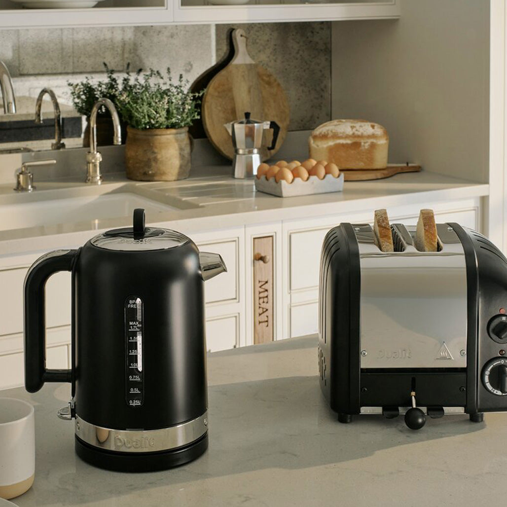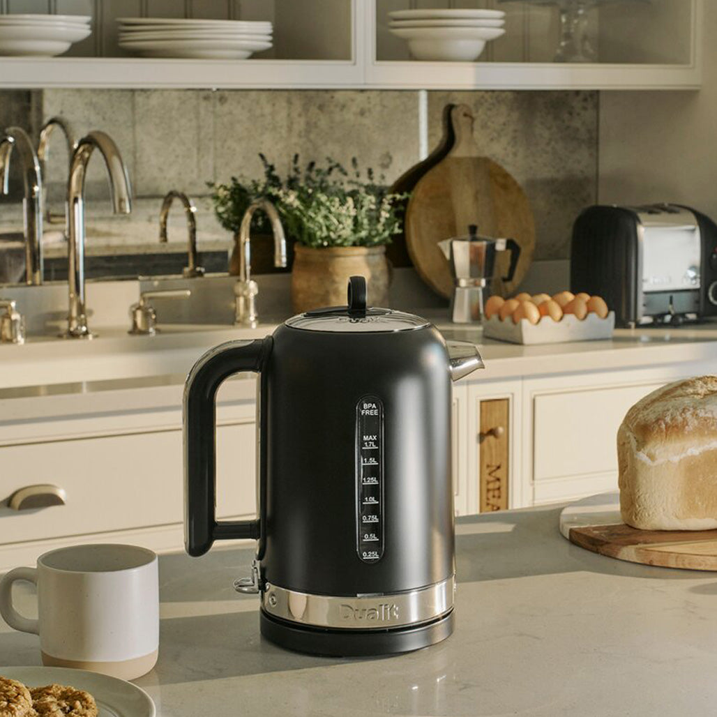 Vannkoker Classic fra Dualit. Classic-kjelen fra Dualit er det britiske kjøkkenselskapets mest solgte vannkoker i klassisk kromdesign som passer inn i moderne kjøkken i alle dens former. Den multi-patenterte kjelen er fullpakket med funksjoner som gjør det enklere å koke store mengder vann enn noen gang, med både en rask og lydløs kokefunksjon som gir deg kokt vann på kort tid. Med sine to vinduer med både volum- og koppindikatorer varmer du enkelt opp akkurat den vannmengden du trenger, enten det er til servering av te eller raskt kokende pastavann. Dualits Classic Kettle er også bygget for å vare, og har blitt fullstendig ombygd med utskiftbare deler for å drastisk forlenge vannkokerens levetid med uendelige reparasjonsmuligheter.