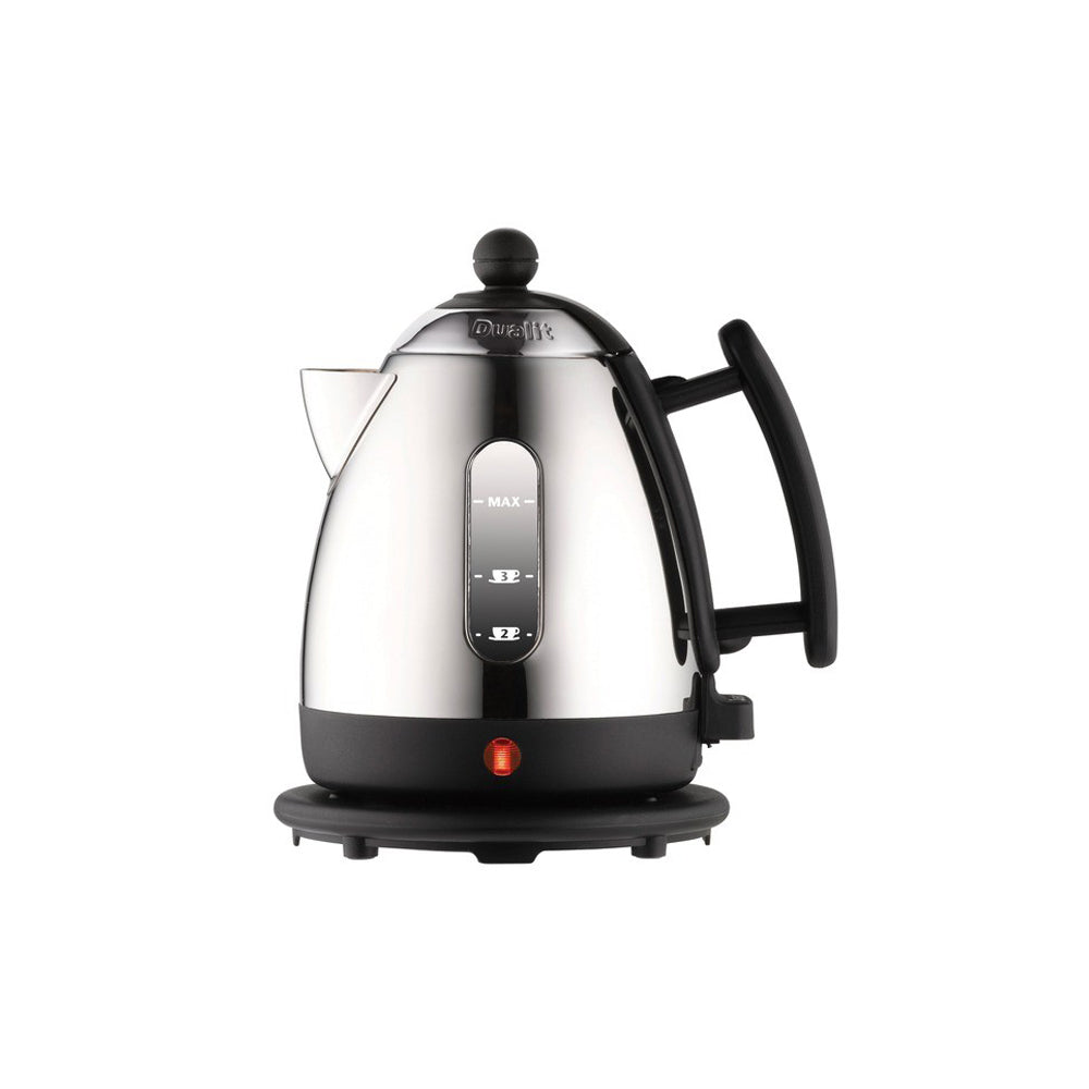 Dualit ledningsløs vannkoker i stilren design laget i rustfritt stål med varmebestandig materiale i håndtak og lokk-knopp.