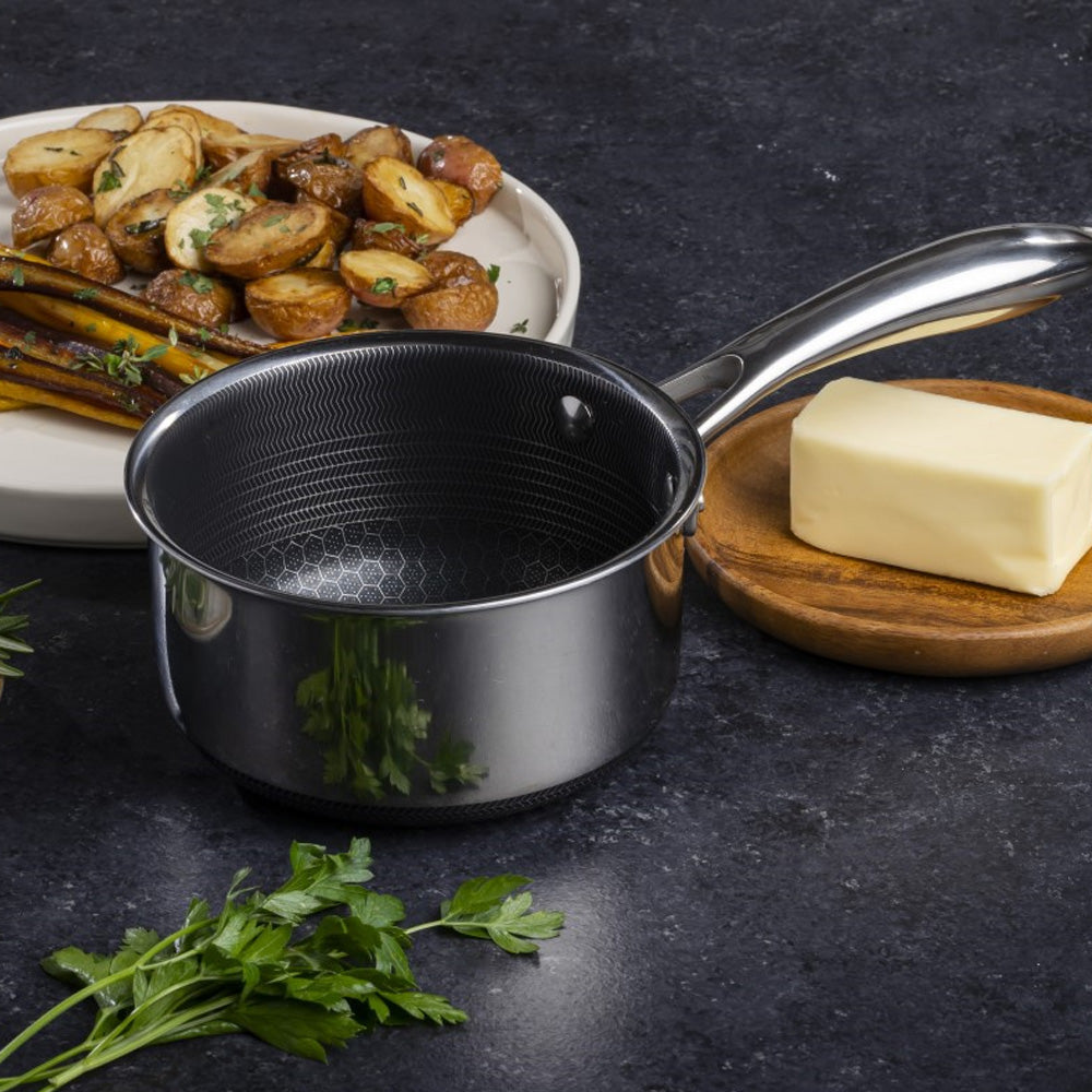 Denne gryten har de samme egenskapene til stekepannen fra Hexclad. De har skapt noe fantastisk vakkert med sin patenterte teknologi. Stekepanner og gryter kombinerer holdbarheten til støpejern, ytelsene til stål og fordelene med non-stick, i ett og samme produkt. Det betyr at du kan slippe løs ditt potensiale på kjøkkenet uansett om du skal lage gode sauser og varme opp supper, kraft o.l.