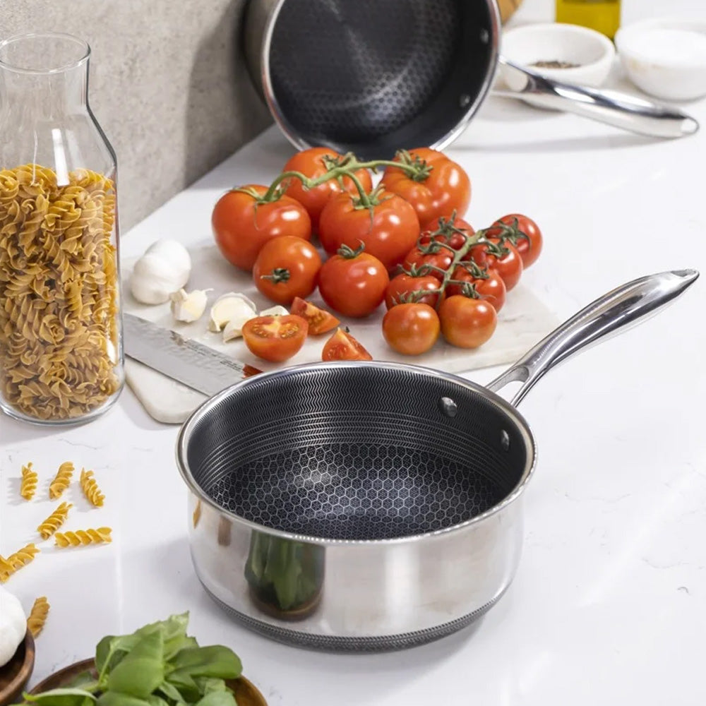 Denne gryten har de samme egenskapene til stekepannen fra Hexclad. De har skapt noe fantastisk vakkert med sin patenterte teknologi. Stekepanner og gryter kombinerer holdbarheten til støpejern, ytelsene til stål og fordelene med non-stick, i ett og samme produkt. Det betyr at du kan slippe løs ditt potensiale på kjøkkenet uansett om du skal lage gode sauser og varme opp supper, kraft o.l.