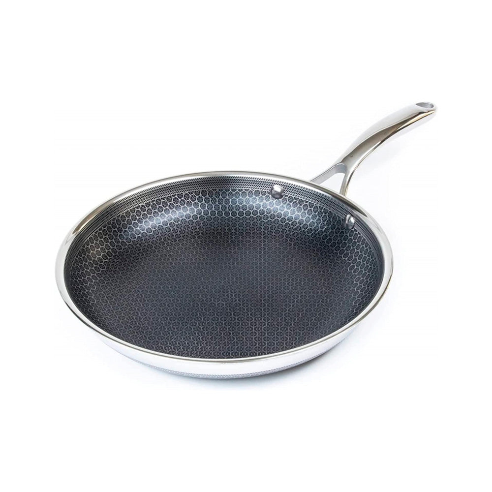 Stekepanne på, ca. 26 cm i diameter. Hexclad er den eneste på markedet som er non-stick på innsiden og på utsiden. Med Hexclad kan du tilberede alt fra den mest delikate fisken til en saftig og perfekt brunet biff uten å bekymre deg for hvilken stekepanne du skal benytte, og produktene er PFOA-frie. Siden du har fordelen av en vanlig non-stick stekepanne og en stålpanne, trenger du kun bruke et minimum av stekefett samtidig som du kan bruke metallredskaper rett i stekepannen.