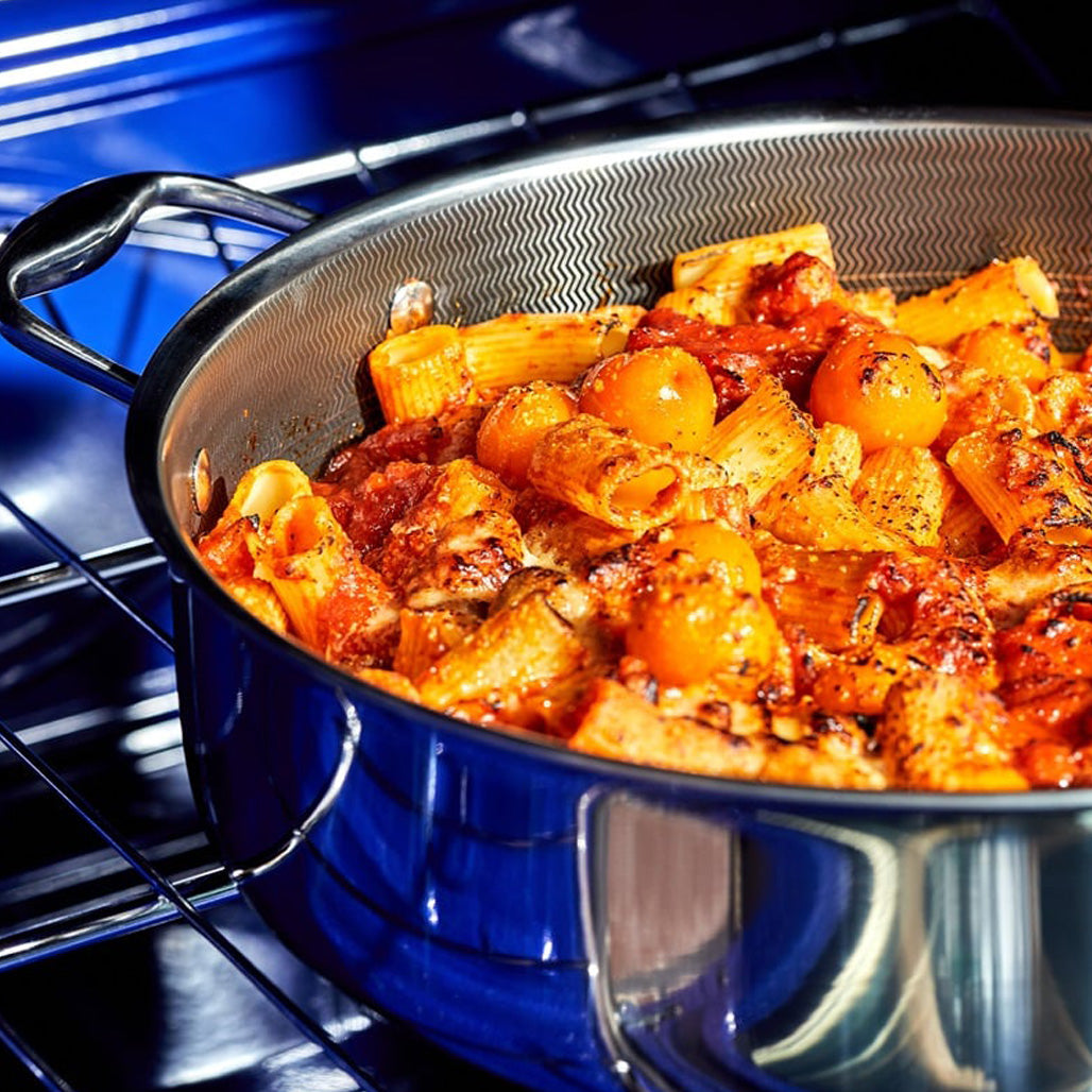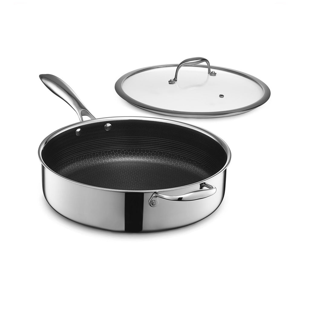 Hexclad har gjenoppfunnet sautépanne og skapt noe fantastisk vakkert med sin patenterte teknologi. Sautépanner ,panner og gryter kombinerer holdbarheten til støpejern, ytelsene til stål og fordelene med non-stick, i ett og samme produkt. Det betyr at du kan slippe løs ditt potensiale på kjøkkenet uansett hva du lager. Hexclad er den eneste på markedet som er non-stick på innsiden og på utsiden. Med Hexclad kan du tilberede alt fra den mest delikate fisken til en saftig og perfekt brunet biff uten å bekymre deg for hvilken stekepanne du skal benytte. Siden du har fordelen av en vanlig non-stick stekepanne og en stålpanne, trenger du kun bruke et minimum av stekefett samtidig som du kan bruke metallredskaper rett i sautépannen. Belegget i våre gryter og panner har et egenutviklet TerraBond™ keramisk non-stick-belegg, som er fri for PTFE og PFAS