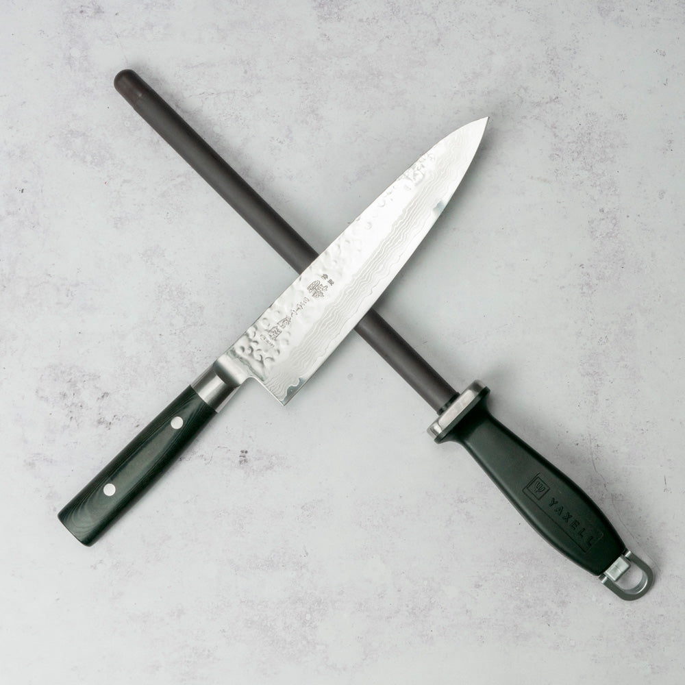 For å opprettholde en skarp egg, er det nødvendig å slipe kniven med jevne mellomrom. Hold Yaxell -kniven din skarp ved å dra kniven en gang i måneden over en slipestav.