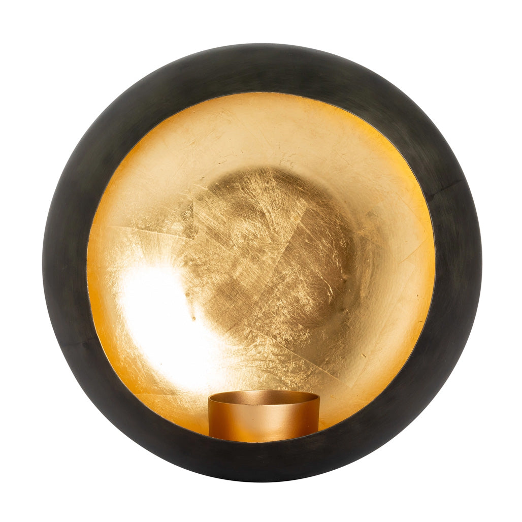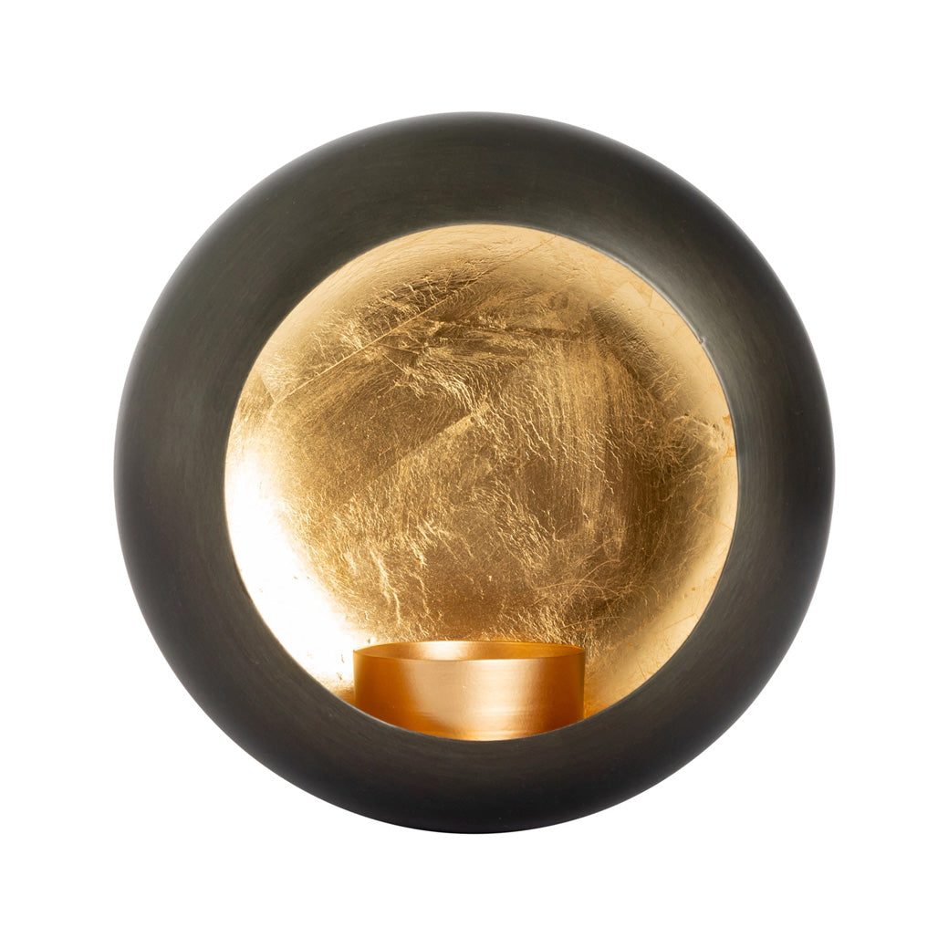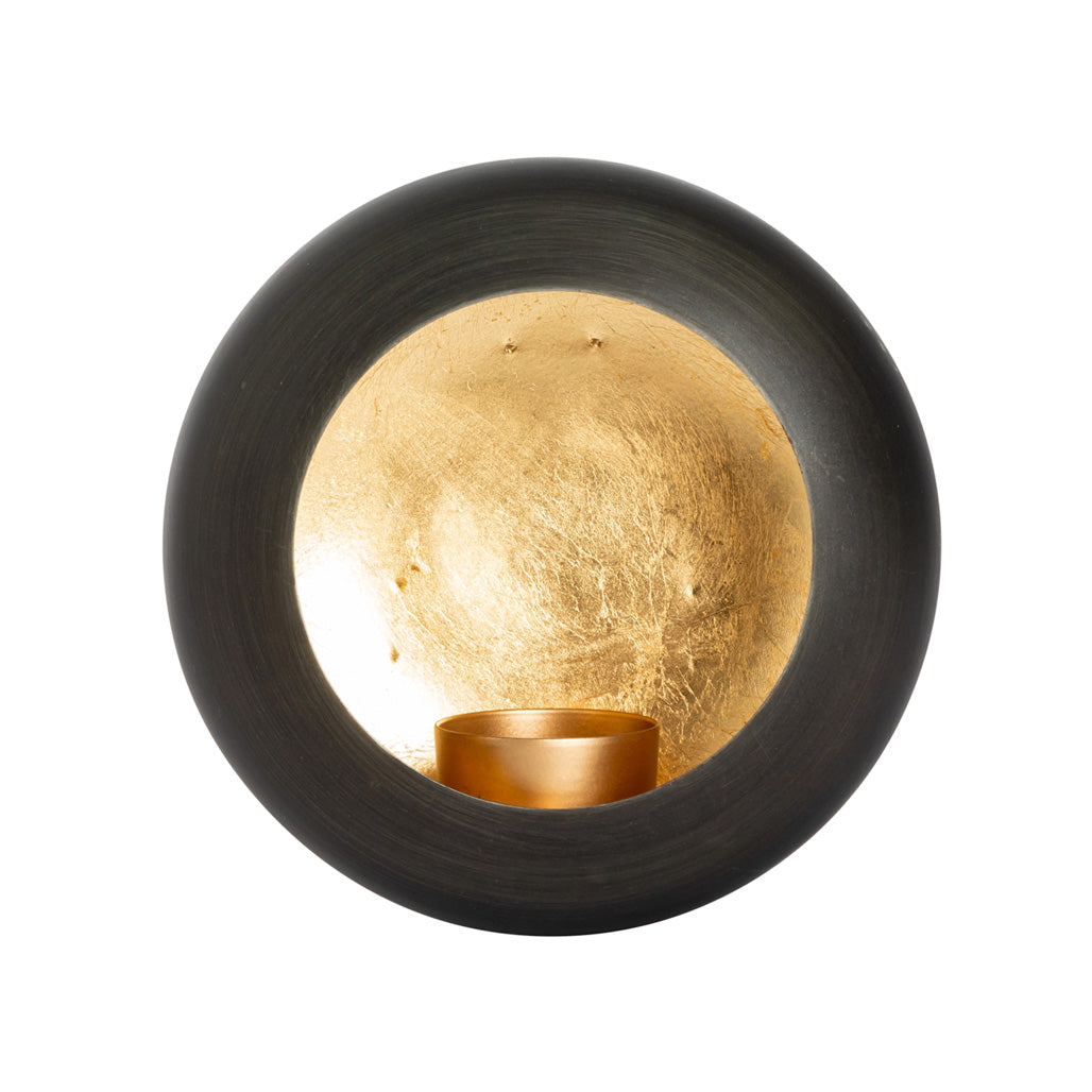 Disse vegghengte runde lysholderne i matt svart metall med gullfarget innside gir et vakkert og varmt lys.