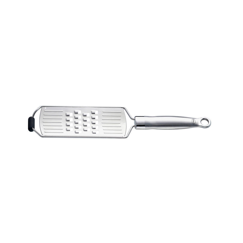 RÖSLE medium rivjern med håndtak i rustfritt stål. Det ergonomiske håndtaket ligger godt i hånden og har en praktisk krok til opphenging.